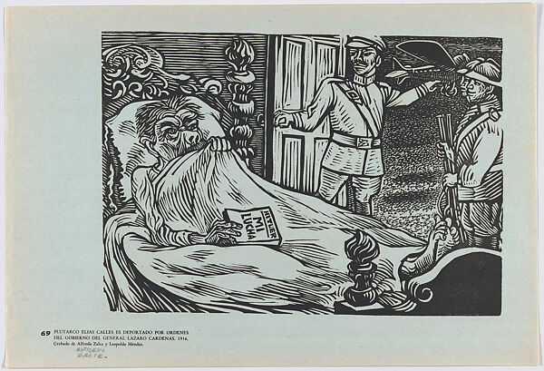 - Title: Plate 69: Plutarco Elías Calles in bed, about to be deported to America on the orders of General Lázaro Cárdenas who stands at right (1936), from "Estampas de la Revolución Mexicana" (Prints of the Mexican Revolution)