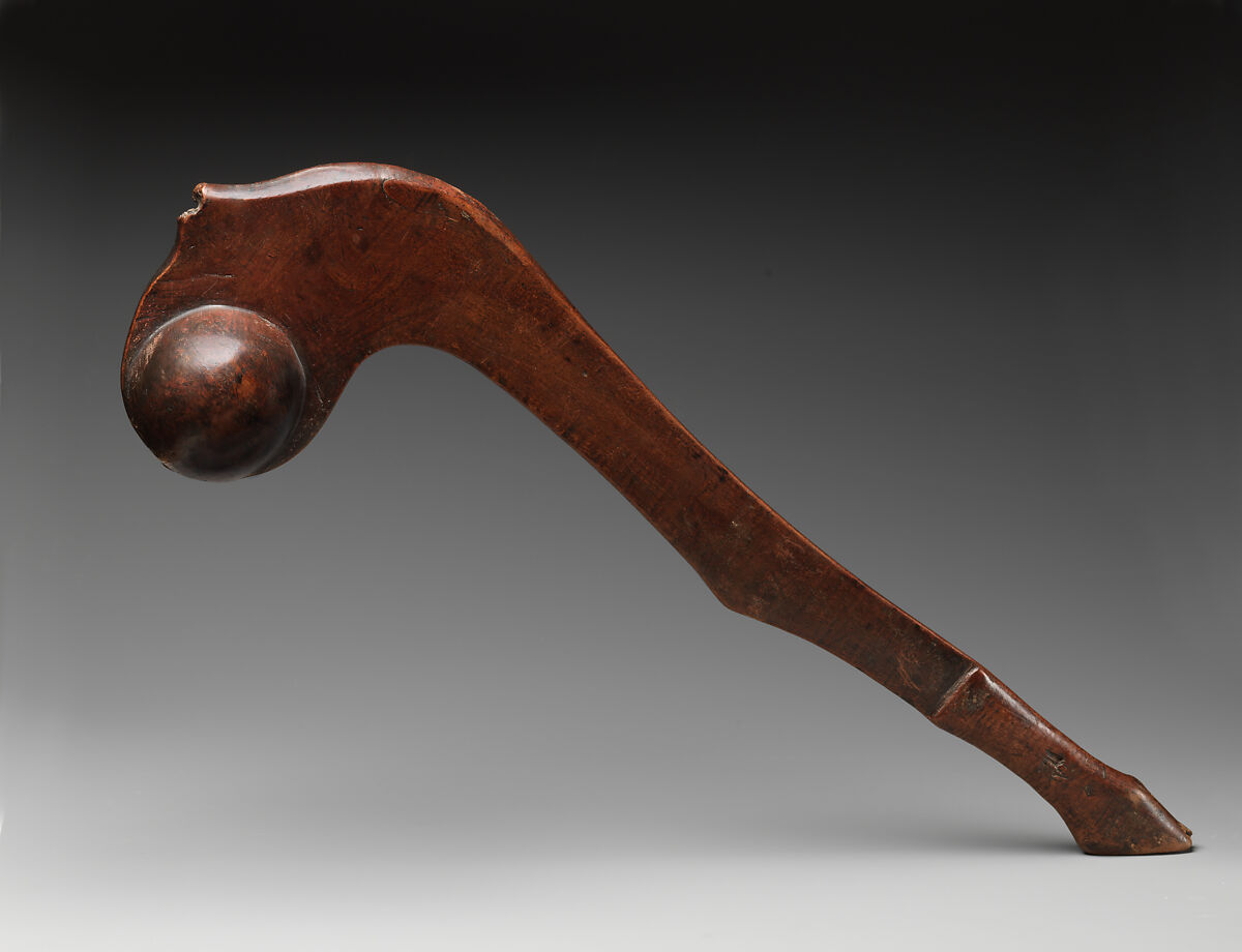 This weapon was carved as an effigy of a deer’s leg. The sculptor carefully chose the hardwood so that the burled portion, where a branch was once attached, would strengthen the angled head. The heavy spherical element seems to have contained a projecting spike designed to split skulls in intertribal warfare or conflicts with Europeans in the Midwest. Highly polished and decorated with red pigment, this club would have been a warrior’s prized possession.