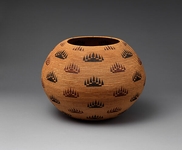 Great Basin peoples revered the unique semi-desert landscape between the Rocky and the Sierra Nevada Mountains by producing practical containers out of the diverse grasses found there. Datsolalee was a pioneer of basket weaving at the turn of the twentieth century. She is known for departing from traditional Washoe forms and imagery by creating iconic monumental containers with syncopated patterns, such as this one with offset rows of flame motifs. The dark fern root fibers contrast with the redbud shoots and the willow background to create a striking visual experience. Using the coiling technique with such materials, she infused an everyday object with extraordinary beauty.