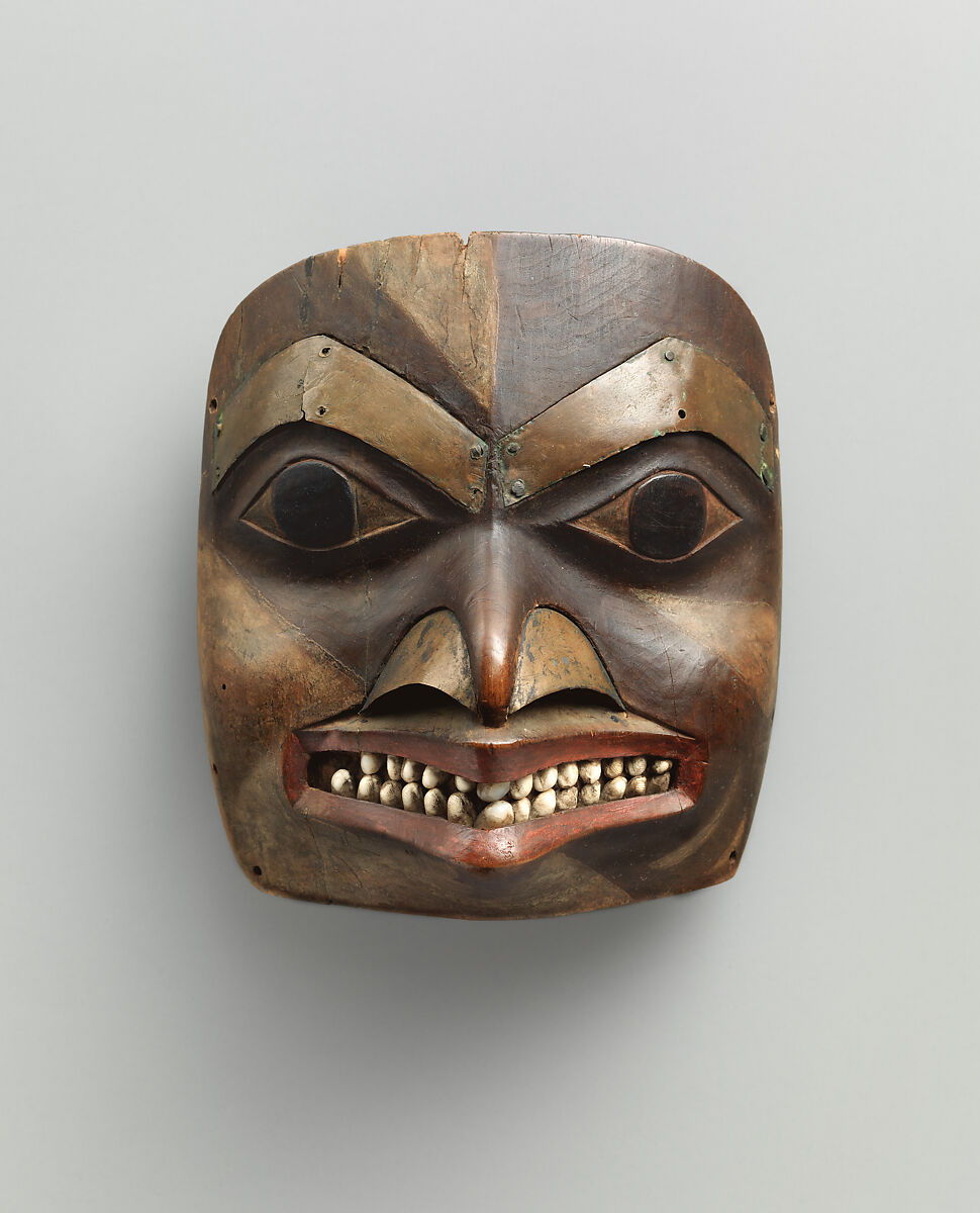 Pacific Northwest clan leaders hold potlatch ceremonies to renew their social status through a costly feast and gift exchange. Traditionally, the host would accumulate food, clothing, and trade goods, such as marine shells and copper, and commission specialized artists to create dance masks to further display this wealth. This ritual maskette or frontlet is pierced around the edges to affix it to a headdress assemblage. The blindingly white teeth are made of highly valued opercula, a hard plug that allows the marine mollusk to close its shell. The mask’s pointy nose may reference the beak of a bird or the mouth of an octopus.