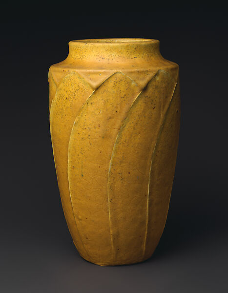 William H. Grueby founded his art pottery in Boston, Massachusetts, after first operating a successful tile works. His exposure to contemporary French ceramics at the 1893 World’s Columbian Exposition in Chicago marked a turning point in his career. He admired the novel matte glazes of the French studio potters, and was especially attracted to the relief designs he saw on the stoneware of August Delaherche. He developed his distinctive glazes, notably his dense, opaque matte green glaze, often with irregular veining that critics compared to the skin of a watermelon. Colors, such as the yellow of this vase, are rarer in the firm’s oeuvre. Most of his vessels feature relatively simple modeled decoration of stylized broad leaves. Many of his designers were conceived by Boston architects, George Prentiss Kendrick and Addison Le Boutillier. In customary practice, the throwing, glazing, and firing was done by men, and the decoration was executed by a small staff of mainly women. They would roll out thin ropes of clay and apply them to the vase’s surface, further modeling, tooling, and carving them to finish the designs.
