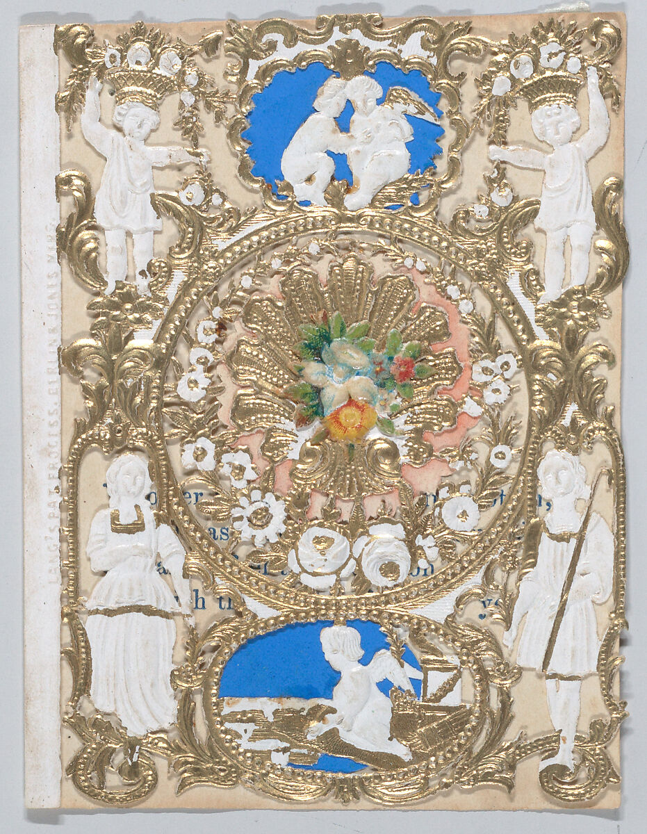 - Medium: Open-work, cameo embossed, gilded lace paper, chromolithographed die-cut scraps, colored paper