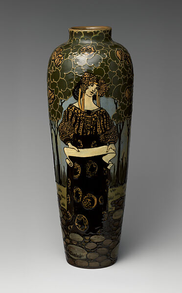 Born and trained in England, Frederick Hurten Rhead became one of America’s most influential ceramist, working at potteries across the country. An important teacher, he was also one of the leading American champions of modern design, not only in theory but in practice. Rhead came to the United States in 1902, and his first position was with the Avon Pottery in Tiltonsville, Ohio, near Zanesville and the location of a number of important American art potteries. This important vase features a graceful Pre-Raphaelite woman in a medievalizing gown patterned with Japanesque motifs, standing in a highly stylized landscape. It is likely that Rhead conceived of this design in England, and for this vase, it was then decorated by Rhead’s compatriot, the highly skilled Albert Cusick. Indeed, it is entirely English in its approach, and brings to mind similar Pre-Raphaelite women in long flowing gowns of patterned textiles such as those seen in the figural windows of a few decades earlier by Daniel Cottier (see 2007.43). The technique is one that Rhead also favored—utilizing flat washes of colored slip and raised clay tube lining, or piping.