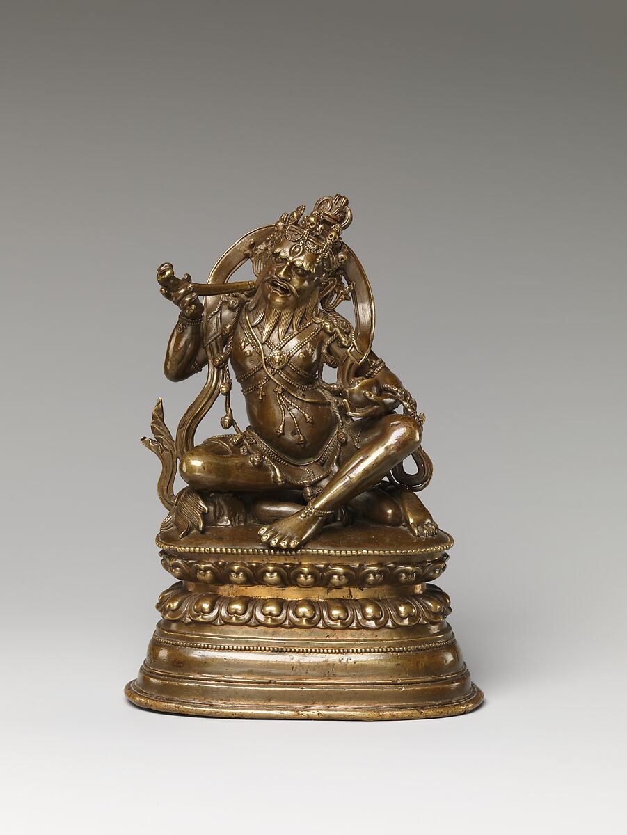 Brahmarupa, a benign form of the wrathful deity Mahakala, is shown as a bearded nomadic ascetic, sitting on a corpse, wearing a bone apron and holding a thighbone trumpet and a skull cup. A protector of the Sakya school of Tibetan Buddhism, he is credited with introducing the Hevajra Tantra, an important Vajrayana text, to the Sakya hierarchs.