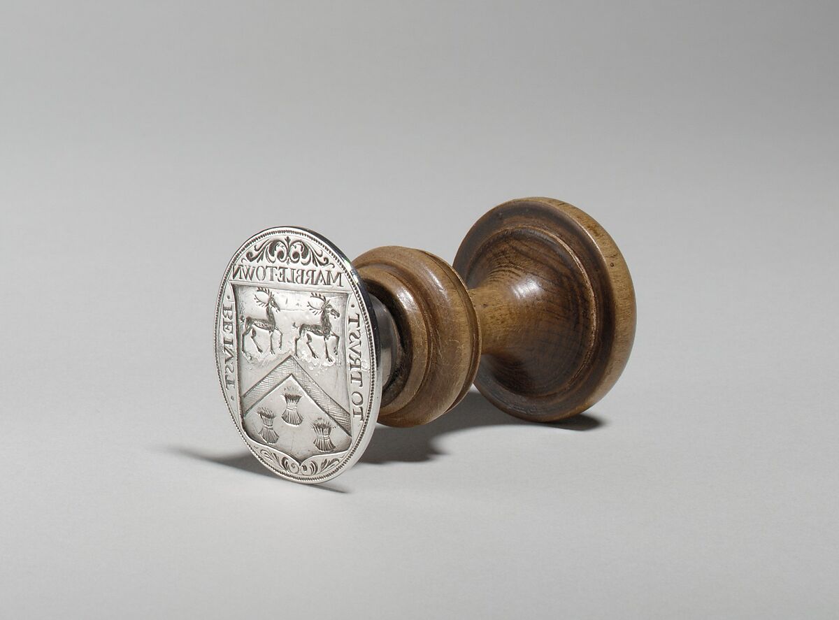 Governments, universities, and other organizations commissioned silversmiths to supply official silver, such as seals with which to stamp important documents. Surviving records in Marbletown, New York, indicate that the silversmith Jacob Boelen was hired in 1704 to make the town seal. In the upper register of its shield are two deer, symbolizing the mountainous hunting region around Marbletown. In the lower register, three sheaves of wheat allude to the surrounding lowland, fertile and well suited to the cultivation of grain. The town's name and motto "BE JUST / TO TRUST" are engraved around the edges.