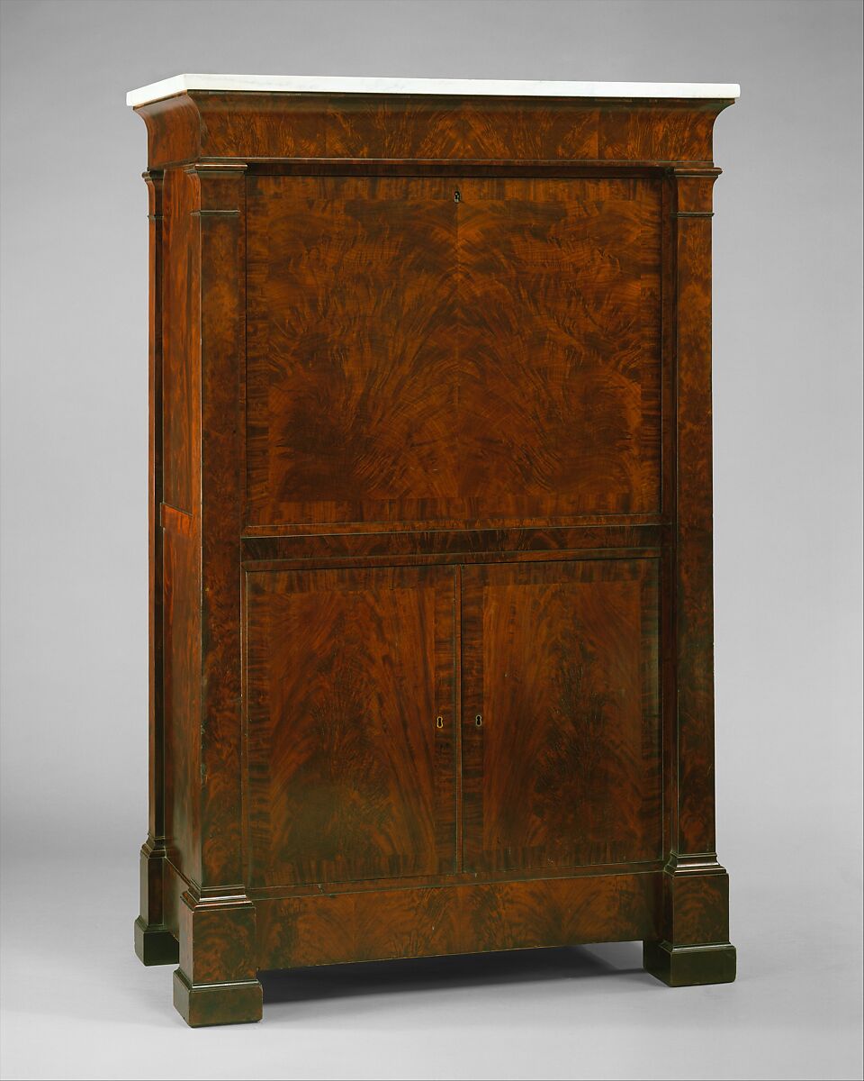 The rippling figure of mahogany veneers sheaths the Classically inspired columnar supports and architectonic mass of this secrétaire à abattant, or "French secretary" according to the 1834 New York cabinetmakers’ price book. In the 1830s and 40s, the Phyfe workshop embraced the revival of Grecian designs and use of flashy veneering techniques popularized by their French counterparts. The Phyfe workshop produced very few secrétaires but may have based this form on number 368 of volume one (1813-1815) in Pierre de La Mésangère’s Collection de Meubles et Objets de Goût (1820–1831). The secrétaire employs sophisticated hardware such as spring-locked drawers for the safekeeping of valuables and a drop-fron with a weighted iron balance hinge.