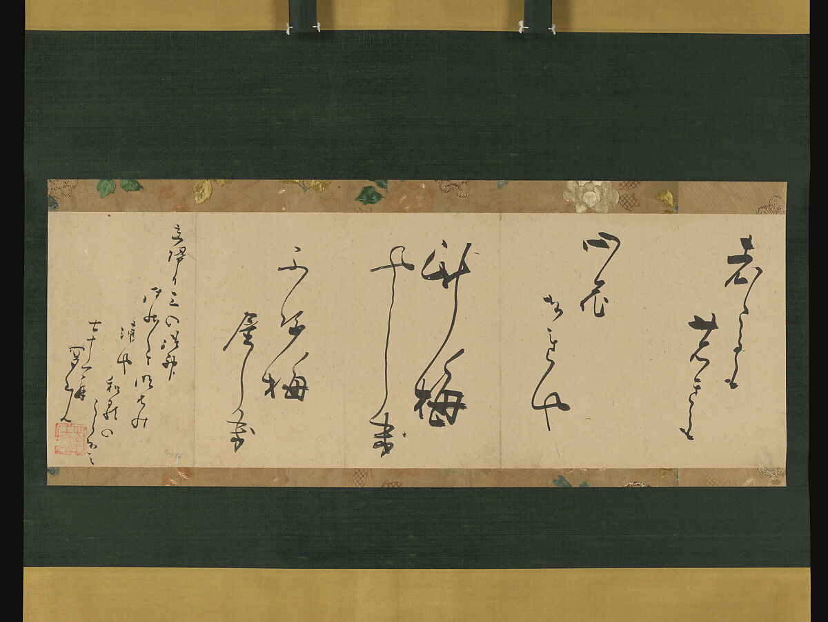 Two Japanese poems, one in oversized characters, the other more compactly rendered, are inscribed with dynamic flourish by Shokusanjin (Ōta Nanpo), one of the great literary arbiters of late Edo-period salon culture. The first poem celebrates the “New Plum Residence” in Edo (present-day Tokyo), which still survives, and includes the “Garden of One Hundred Flowers of Mukojima” (Mukojima Hakka-en), originally built by Sawara Kikuu (1762–1831), a wealthy literatus and antiquarian. The second poem is about the three spirits of poetry, Sumiyoshi-gami, Tamatsushima-gami, and Tenman-tenjin.