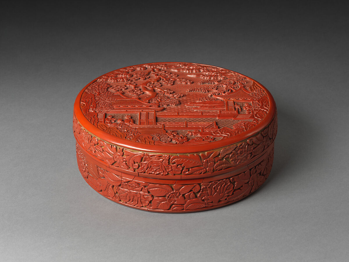 This circular box is a classic example of carved red lacquer from the early Ming imperial workshop. Intricate diaper patterns differentiate the sky, water, and terrace, and the meticulous carving and elegant design are hallmarks of the finest quality carved lacquers from this period. A garden scene framed by a foreground rockery is seen on the cover, where a scholar seated by an elegant hall looks out over a pond of blossoming lotus while his youthful attendant prepares tea. The scene recalls the famous Song-dynasty scholar and legendary lotus-lover Zhou Dunyi (1017–1073).