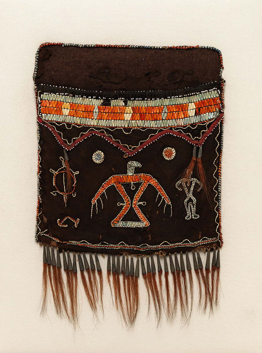 The images on this black-dyed bag, traditionally used to hold amulets and other personal possessions, are part of the pictorial language of Great Lakes cultures. The figures and abstractions express a complex universe alive with seen and unseen forces. In 1845 the Anishinaabe Methodist minister Peter Jones wore the pouch in Edinburgh, posing for a group of photographs that are considered the earliest of an identified Native North American. The strap is now missing.
