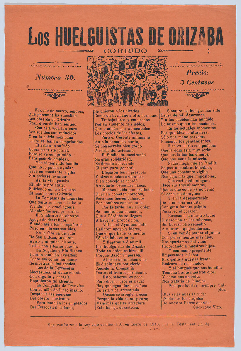 Broadsheet relating to a worker's strike in Orizaba, workers holding up the Mexican flag, flanked by soldiers