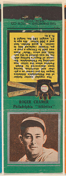- Title: Roger Cramer, Philadelphia Athletics, from the Baseball Players Match Cover design series (U1) issued by Diamond Match Company