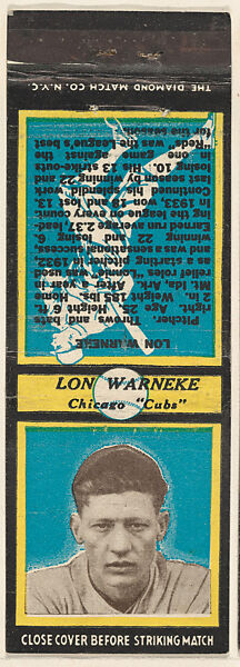 • Title: Lon Warnecke, Chicago Cubs, from the Baseball Players Match Cover design series (U2) issued by Diamond Match Company