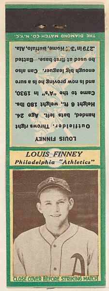 - Title: Louis Finney, Philadelphia Athletics, from the Baseball Players Match Cover design series (U3) issued by Diamond Match Company