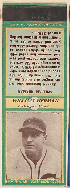 • Title: William Herman, Chicago Cubs, from the Baseball Players Match Cover design series (U3) issued by Diamond Match Company