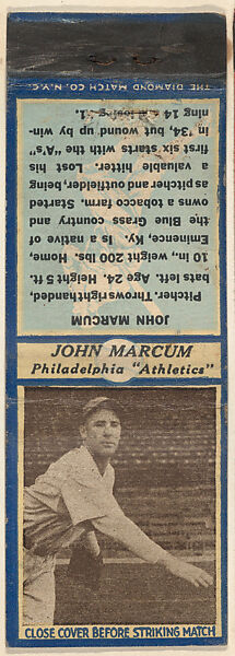 - Title: John Marcum, Philadelphia Athletics, from the Baseball Players Match Cover design series (U3) issued by Diamond Match Company