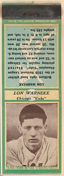 - Title: Lon Warnecke, Chicago Cubs, from the Baseball Players Match Cover design series (U3) issued by Diamond Match Company
