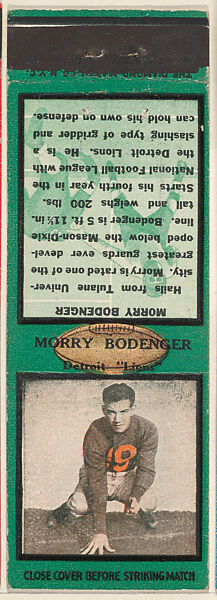 - Title: Morry Bodenger, Detroit Lions, from the Football Players Match Cover design series (U6) issued by Diamond Match Company