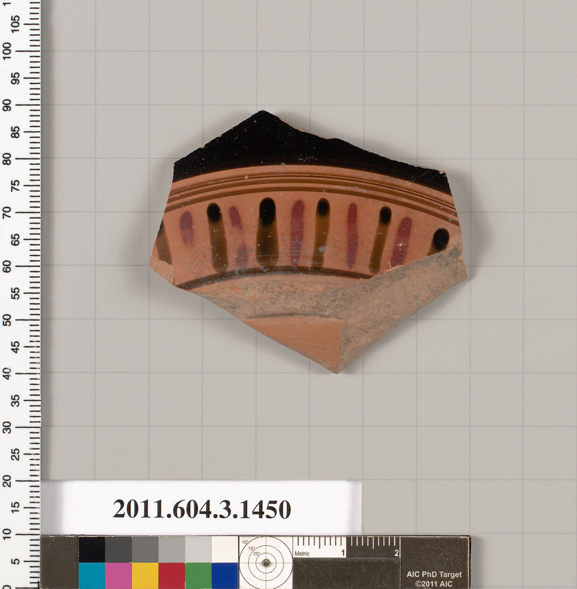 Band of tongues, alternating with black and red, framed at the top by three thin black glazed lines, and, at the bottom by a single black glazed line; part of the foot; the underside is unglazed