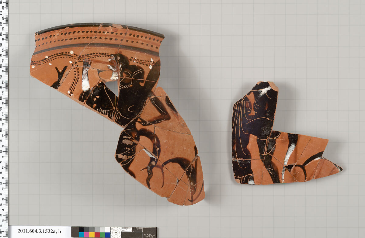 On the larger fragment, below the rim, dot ivy; right hand of a male holding a drinking horn?; draped maenad to left, playing the aulos; satyr to left, with his left arm bent, and his hand at his waist; in the back ground, vines; start of handle root; below the handle root, a dolphin to right; the smaller fragment depicts a satyr to left, approaching a maenad from behind; at the bottom right, tail of a dolphin