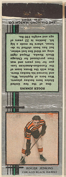 • Title: Roger Jenkins, Chicago Black Hawks, from Silver Hockey Players Match Cover design series (U9) issued by Diamond Match Company