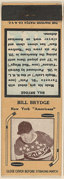 - Title: Bill Brydge, New York Americans, from Yellow/Tan Hockey Players Match Cover design series (U10) issued by Diamond Match Company