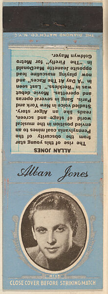 - Title: Allan Jones from Movie Stars Match Cover design series (U21) issued by Diamond Match Company