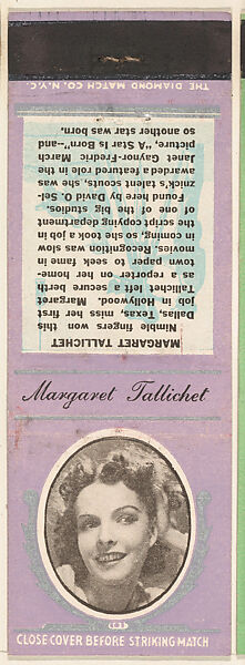 • Title: Margaret Tallichet from Movie Stars Match Cover design series (U21) issued by Diamond Match Company