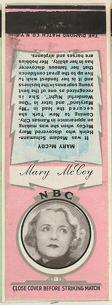 - Title: Mary McCoy from NBC Radio Stars Match Cover design series (U23) issued by Diamond Match Company