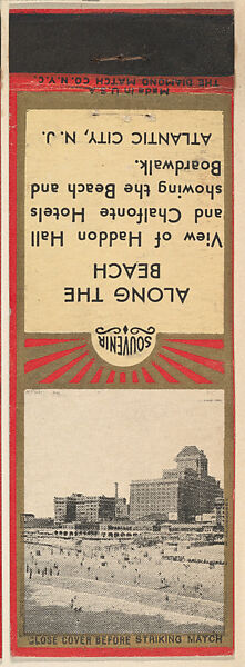 Matchbooks from Atlantic City, New Jersey, Souvenir Views Match Cover series (U40.1) produced ca. 1935–45 by Diamond Match Company, New York. Printed on saddle in half circle: SOUVENIR. Green/gold, blue/gold or red/gold color. Back may include short sentence regarding particular local attraction or landmark.