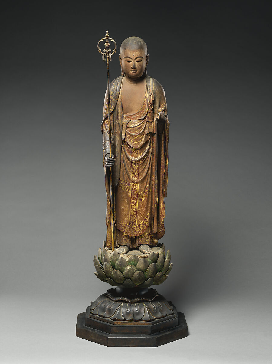Jizō is a Bodhisattva, an enlightened being who, out of compassion, leads others along the Buddhist path. He is best known for rescuing souls from hell and protecting children. In this sculpture, Jizō is portrayed as a youthful monk with a shaved head and a patchwork surplice over his robe. He wields a monk’s staff in his right hand—which he rattles to awaken humans from their delusions—while in his left he holds a jewel of wisdom that grants all wishes. Jizō’s long earlobes and the urna on his forehead symbolize his enlightened state. This sculpture, one of only three surviving works bearing the name of the sculptor Intan, is signed on one of the wood tenons used to slot the bodhisattva’s feet into the lotus base.