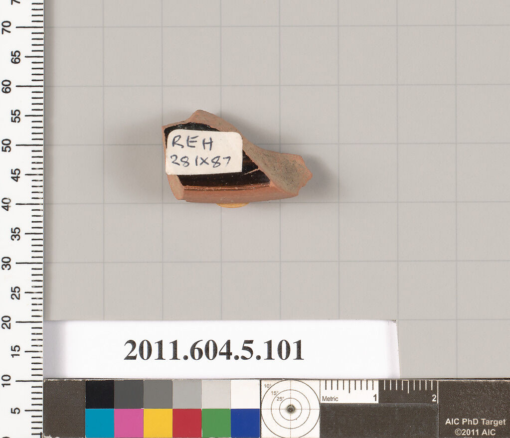 - Title: Terracotta fragment of a stemless kylix (drinking cup)?