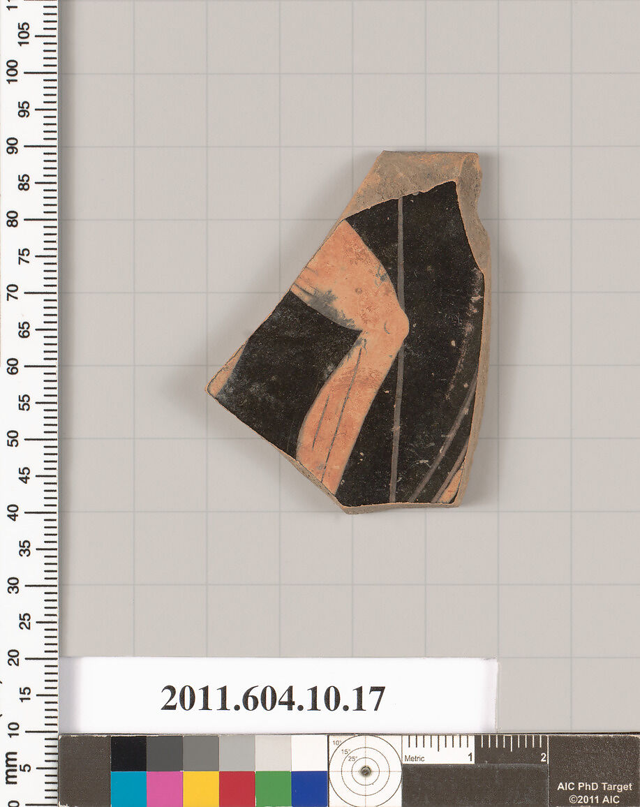 Interior, bent left leg and a bit of the right thigh of a male to right with a spear?; Exterior, part of a circumscribed palmette