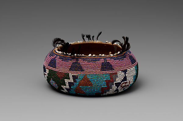 Fine-work gift baskets such as this vibrant example are associated with the Wappo and the Coast Miwok peoples in what is now Napa Valley and Marin County, California. They are highly regarded for their artistic qualities, gifted at special tribal life events, such as marriages. Many were also made for a Euro-American market—a critical means of support for Indigenous communities and avidly collected outside of them—especially in the early twentieth century.