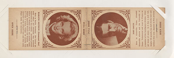 From Star Folders Special Cards (W439). Horoscope-Fortune backs. Sepia toned. Double-sided with an individual movie star's photo within circle on each side. Male on one side and female on other side connected by perforated fold. Short biography/statistics of each star below image. Instructions: OPEN HERE (at bottom) and PULL HERE (at top). Back includes "Your Fortune".
