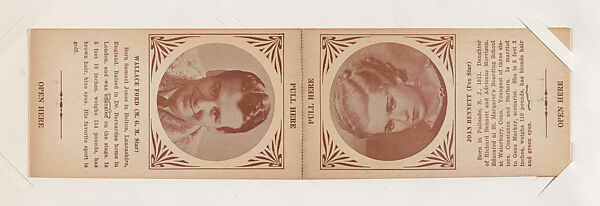 From Star Folders Special Cards (W439). Horoscope-Fortune backs. Sepia toned. Double-sided with an individual movie star's photo within circle on each side. Male on one side and female on other side connected by perforated fold. Short biography/statistics of each star below image. Instructions: OPEN HERE (at bottom) and PULL HERE (at top). Back includes "Your Fortune".