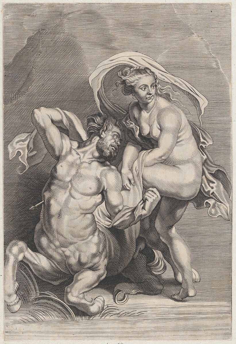 Deianeira receiving the poisoned tunic from Nessus, and the wounded centaur falling to the ground at left