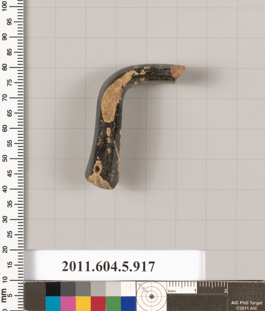 Part of the left half of a kylix handle and part of the crosspiece; at the bottom left, a hole from an ancient repair