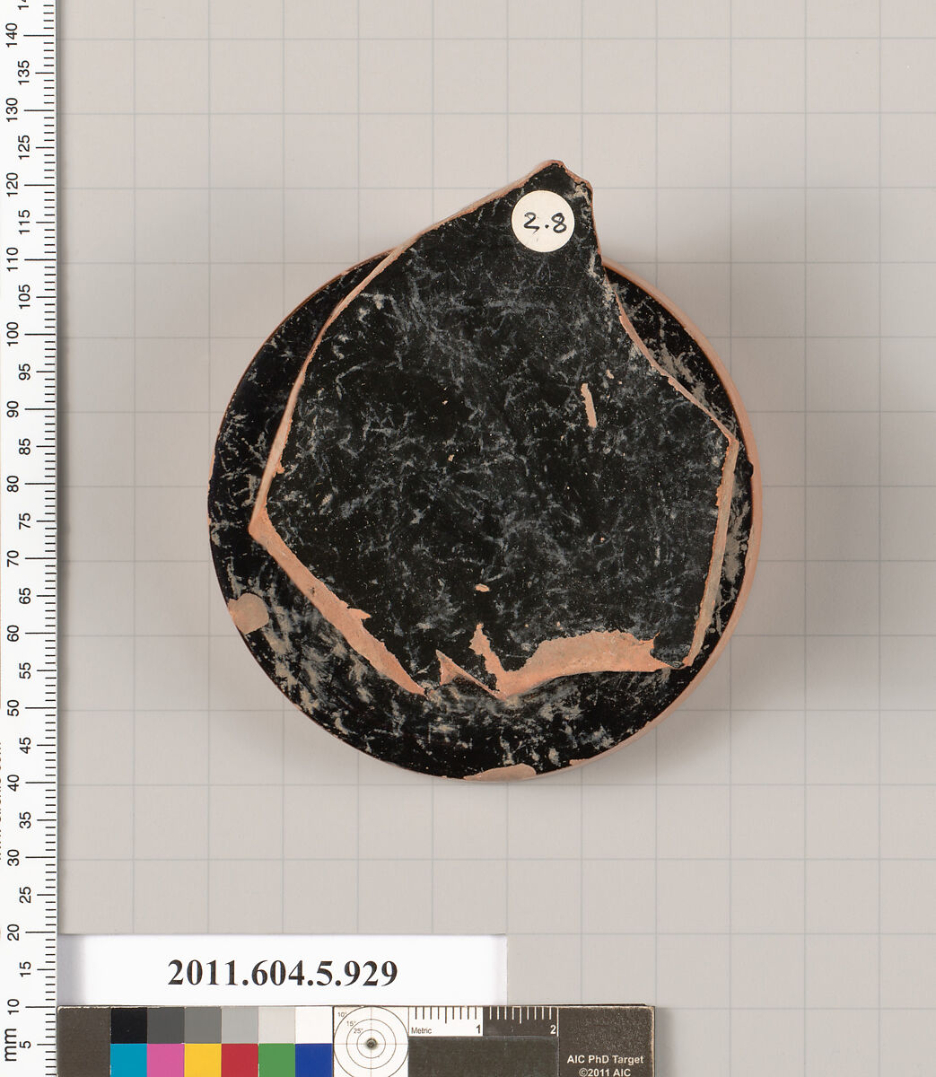 Black glazed fragment from the center of a kylix, at the juncture of the bowl of the kylix and the foot, a ring, articulated by a chamfer at the top and bottom; the complete foot is preserved; the outer edge and resting surface of the foot is reserved; the inner wall of the foot is glazed; the underside is reserved, and, has in the center, a black glazed circle, with a smaller circle in the middle, which has a dot in the center