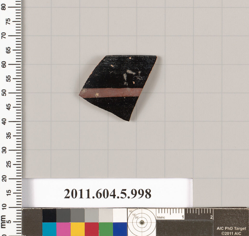 Black glazed rim fragment from a kylix?, with part of a red glazed line