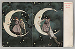At the height of the picture postcard craze in the early twentieth century, photo studios at beach resorts, state fairs, carnivals, and downtown arcades offered a variety of playful props and backdrops for sitters to pose against. During the same period, there was a resurgence of popular interest in the romance of the Moon, as evidenced in countless Tin Pan Alley songs, such as "Shine On, Harvest Moon" (1908), "By the Light of the Silvery Moon" (1909), and "I’ll Sit Right on the Moon and Keep My Eyes on You" (1912). Given this confluence, it is not surprising that one of the most popular studio props was the "paper moon," a cut-out crescent moon set in front of a backdrop painted with stars and the occasional comet (inspired by the passing of Halley’s comet in 1910). Decades before the first spacecraft were launched into orbit, thousands of individuals commemorated their own imaginary lunar voyages with these charming photographic souvenirs.