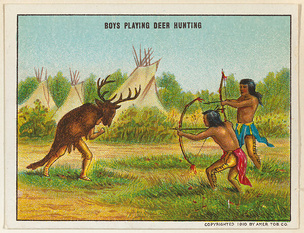 - Title: Boys Playing Deer Hunting, from the "Indian Life in the 60's" series (T73), issued with Hassan Cork Tip Cigarettes by the American Tobacco Company