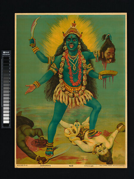Kali—astride Shiva’s prone body, attired in a skirt of severed arms, and garlanded with human heads and hibiscus—boldly confronts the viewer. She brandishes the head of a decapitated demon and gathers his blood in a bowl for drinking. The terrifying realism of this representation held great appeal; the print became one of the most popular works published by the Ravi Varma Press. A studio work produced after the artist’s death, it features bold color fields and a confrontational presentation of Kali that are the antithesis of Ravi Varma’s early style. The Bible Churchmen’s Missionary Society in India wrote of this print in the early twentieth century, “‘What an awful picture!’ We exclaim as we look at the ferocious figure of Kali.”