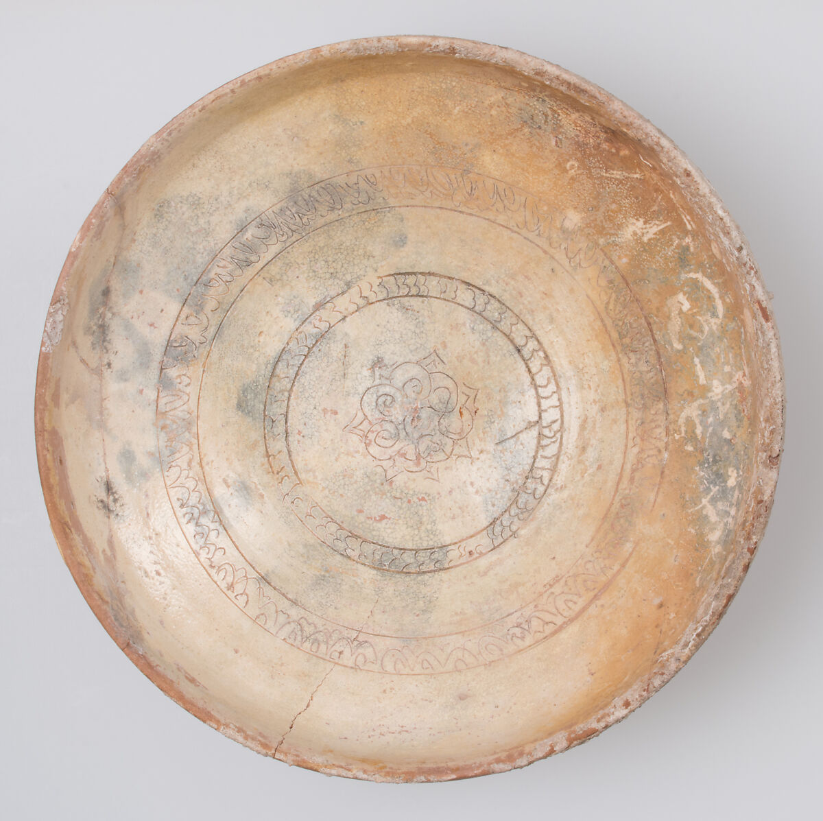 Slipware vessels were widely produced in the Byzantine world for domestic use. Often, as here, the incised patterns were drawn from metalwork designs, suggesting that the ceramics were imitations of metalwork. The central interlace pattern on this work is also found in Byzantine manuscripts as a marker for readings in the Gospels.