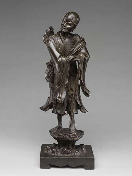 This work of art is currently on loan to the museum.These bronze sculptures (with SL.17.2019.1.1) capture the playful appeal of the Daoist immortals Liu Hai and Li Tieguai. Li supports himself on his famous iron crutch, with an enormous gourd full of magical elixirs slung across his shoulder, while his friend Liu Hai plays with his companion, a massive toad. These lighthearted sculptures would have been well-suited to the reception hall of a cultured family, where their fine craftsmanship and playful spirit would have added a touch of learned whimsy