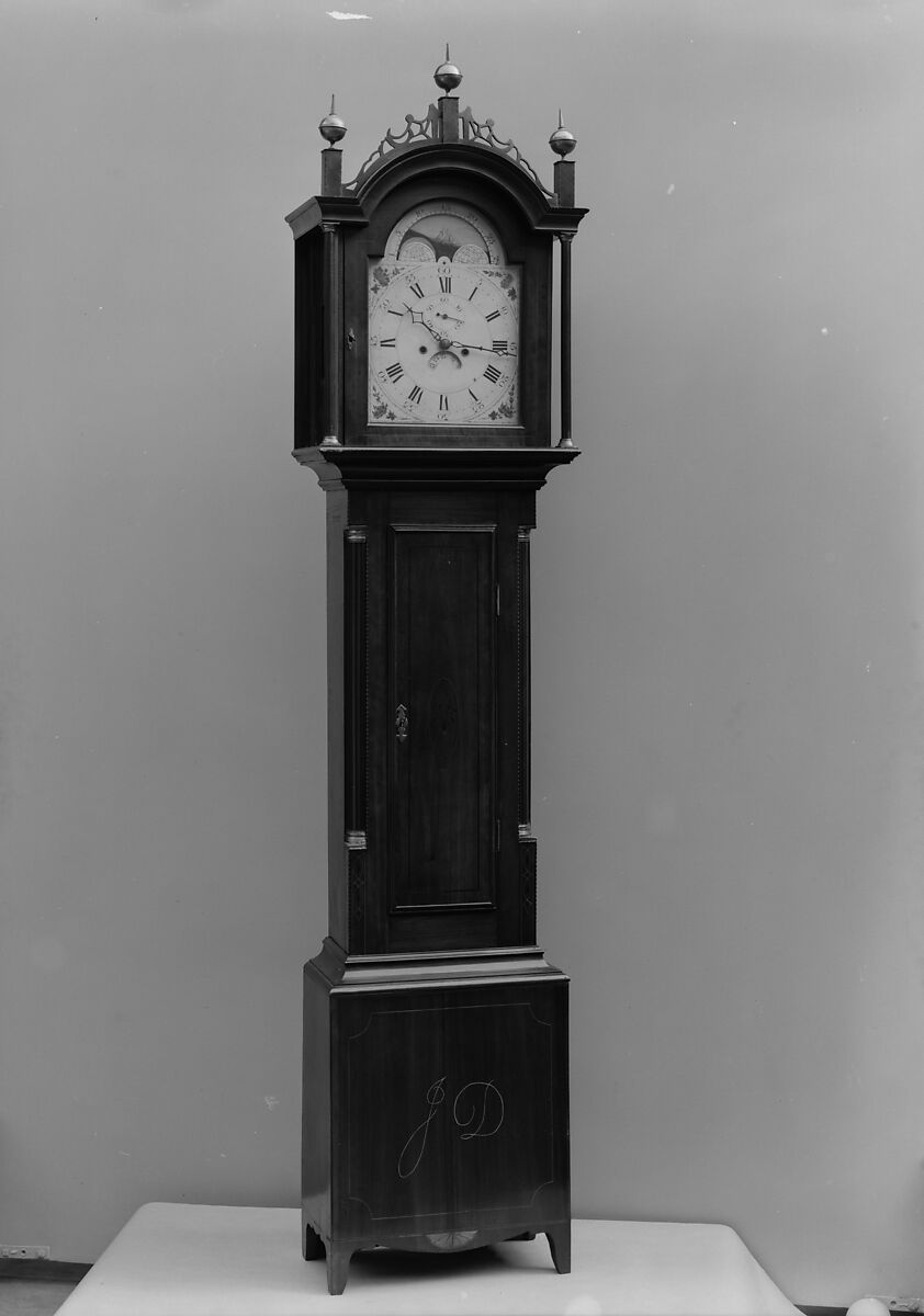 James Dinsmore made the case for this clock. The dial is English. The works are attributed to Paul Rogers of Berwick, Maine.