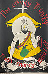 In the latter half of the 1980s, Rukh also set up printmaking workshops to assist women involved in similar movements in the region. The poster The Unholy Trinity was designed by women at a workshop in Koitta, Bangladesh in 1986. The poster depicts a seated religious man, with a sack of money in his lap, with the words "men," "money" and "morality" printed below him. He holds prayer beads in one hand and his other hand reaches out, pressing down on the face of a woman. It was then screen-printed at a workshop Rukh held at the Eidgah Women’s Centre, Sargodha, Pakistan in 1991.