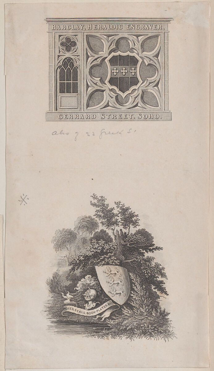 - Title: Trade Card for Barclay, Heraldic Engraver