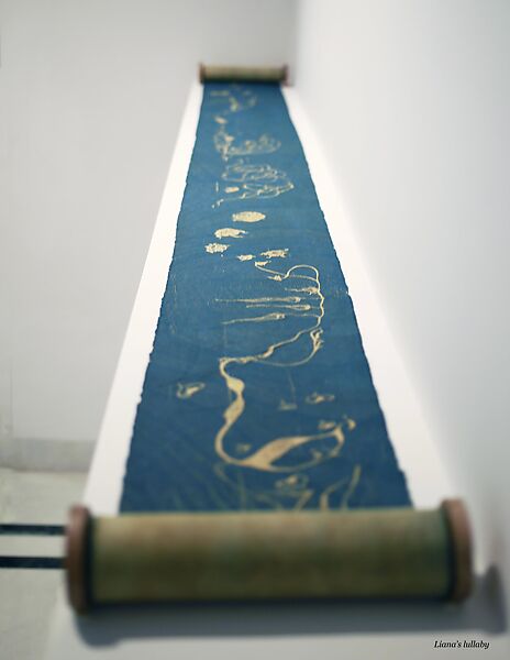 Ranjani Shettar is perhaps best known for her immersive sculptural installations, composed of numerous non-representational forms, which combine natural and industrial materials like beeswax, wood, organic dyes, vegetal pastes, lacquer, steel, and cloth. Her work also includes prints, which employ a range of techniques. Shettar’s skill and ambition are clear in Liana’s lullaby, a 16-foot-long scroll made from five hand carved wood blocks. Shettar first created a series of drawings with watercolor that formed the basis of the woodblocks. The primary inspiration for this work, as with the entirety of her practice, is the natural world. Here it is reflected not only in the wood used for the block printing, but also in her subject, Liana, a woody vine that organically and rhythmically unfolds across this scroll. The vine’s forms are abstracted in a way that might suggest a musical score.