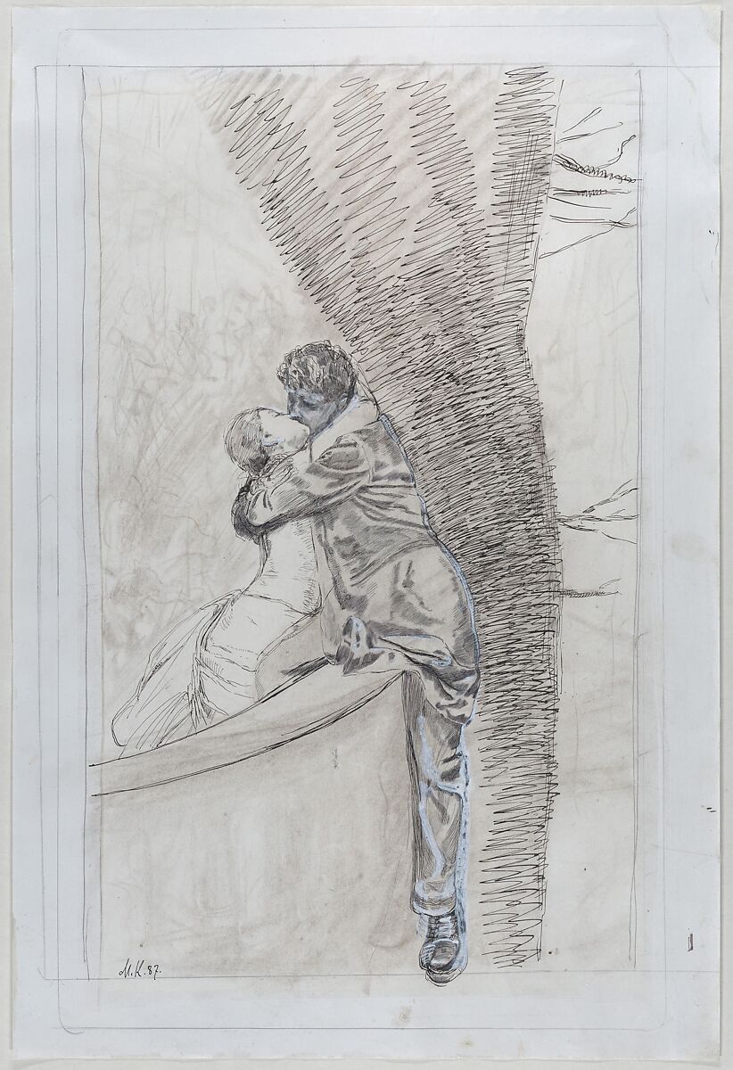 This large-scale sheet showing an amorous couple is titled Im Park. It is the preliminary drawing for an etching of the same title and scale from the print series Eine Liebe: Opus X (A Love). The series is about a passionate affair that ends in tragedy and is likely based on an episode from Klinger’s own life. In this scene, the couple is locked in a tight embrace, the man tightly holding the woman against his own body as he leans against the trunk of a tree. One can see Klinger's mind at work as he plays with the placement of the leg and foot. Many of the small details differ from the final etching.