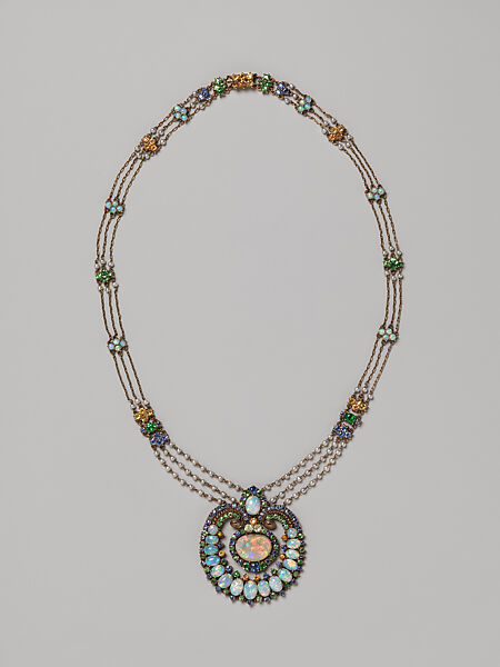 Louis Tiffany developed a special fascination with the constantly changing colors of opals, which are featured here along with demantoid garnets, blue and yellow-orange sapphires, and tiny freshwater pearls. Tiffany & Co.’s gem expert, George Frederick Kunz, was especially enamored of semi-precious stones. This design was probably created by Meta Overbeck under the direction of Louis Tiffany. The necklace appears in a photograph from the Louis Tiffany scrapbook dating from around 1918, helping to suggest a likely dating.